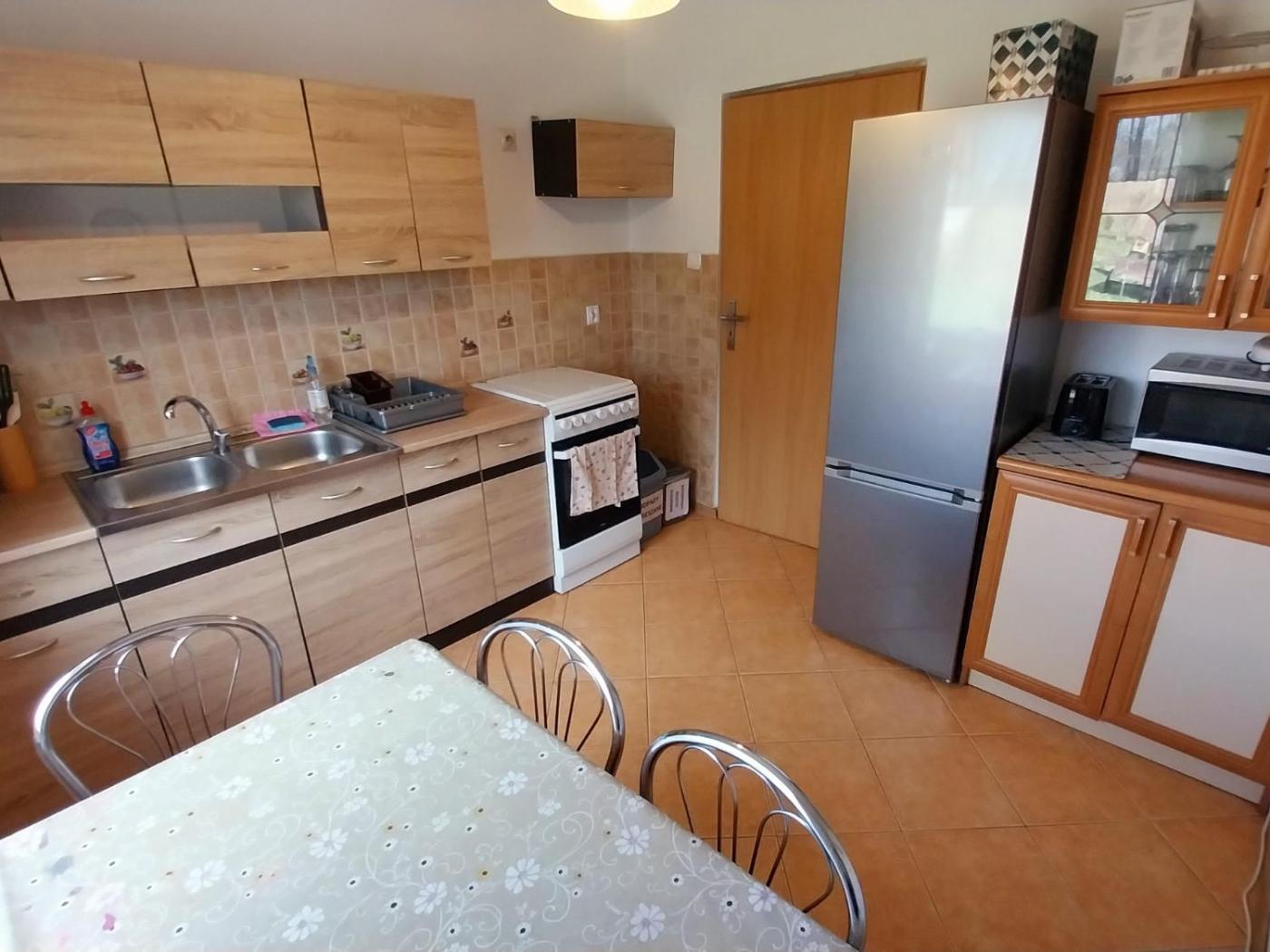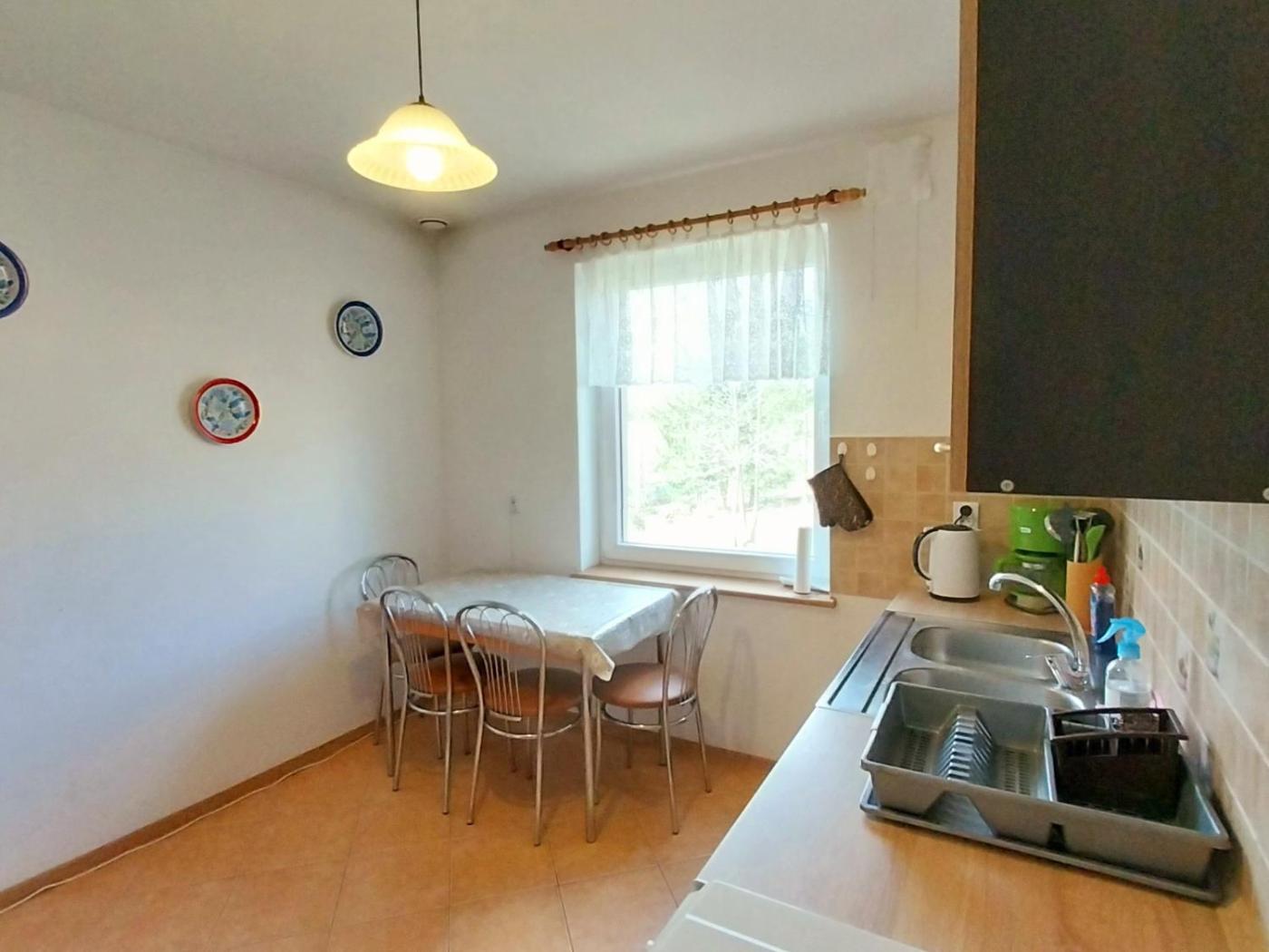 Dom z 3 sypialniami. This holiday home boasts a pool with a view and a fireplace. This spacious holiday home consists of 1 living room, 3 separate bedrooms and 1 bathroom with a bath and a shower. Guests will find a stovetop, a refrigerator, kitchenware and an oven in the fully equipped kitchen. The holiday home also offers a barbecue. The holiday home features a washing machine, a private entrance, soundproof walls as well as a terrace with lake views. The unit offers 7 beds. Dom wakacyjny - 9 osobowy. Powierzchnia pokoju ok.: 120 mkw. ;